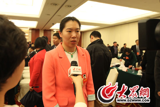 3月7日上午,山東代表團全體會上,全國人大代表、奧運會冠軍、山東省乒乓球運動管理中心女子乒乓球隊運動員李曉霞接受大眾網(wǎng)記者采訪。特派記者 尹海洋 攝