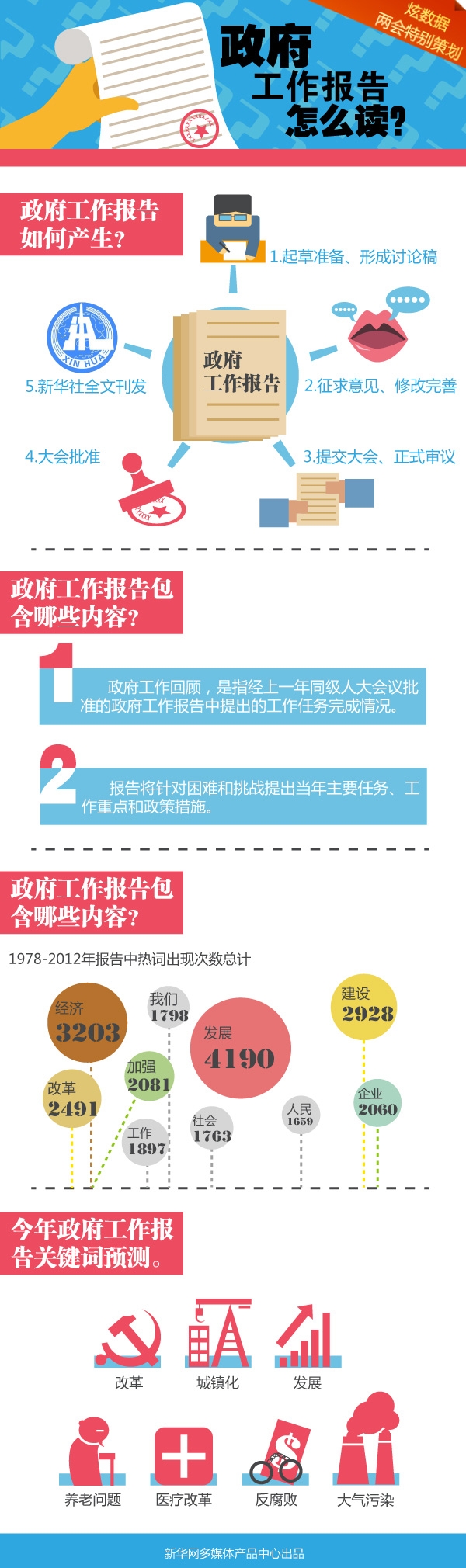 5日上午,第十二屆全國人大二次會議開幕,國務院總理李克強將作他就任總理后的首份政府工作報告,亮出本屆政府治國理政第一年的“成績單”。在歷屆全國兩會盛典中,政府工作報告無疑是最重要的文件,也是一次全面了解政府作為及國情現狀的難得機會。