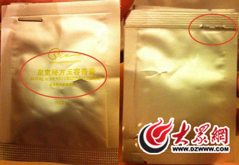 曲姿店給會員美容用的產(chǎn)品用訂書釘裝訂在一起,產(chǎn)品上標(biāo)有“皇室秘方玉容香膏”外無其它內(nèi)容