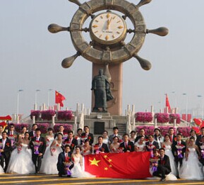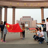 臨沂大學舞蹈學院大一新生陸遠(左二)在臨沂大學體育場,與國旗合影,...