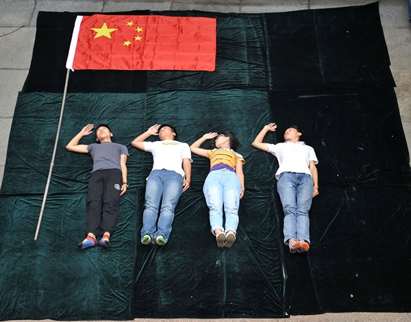 9月25日,山東聊城大學美術學院大學生舉辦我和國旗合個影活動,圖為“跟著國旗方向走”。