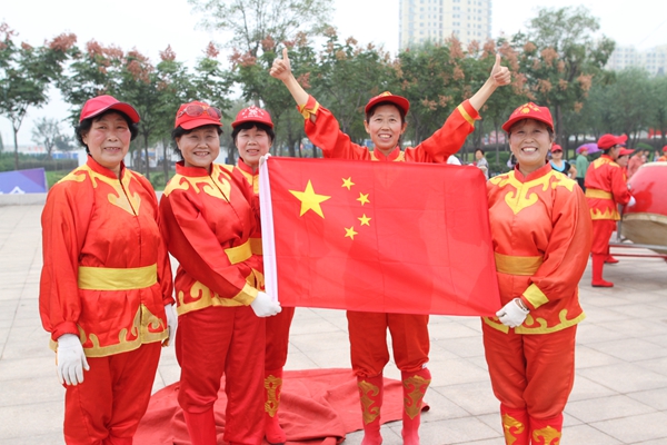 臨沂老年協會威風鑼鼓隊的大媽們在臨沂沂河橡膠壩與國旗合影為中國點贊。