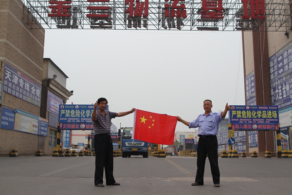 臨沂貨車司機李明與金蘭物流安保趙大成在臨沂金蘭物流基地與國旗合影為中國點贊。