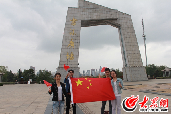 9月29日上午,來自武漢、河南的4名游客,在臨沂書法廣場與國旗合影。