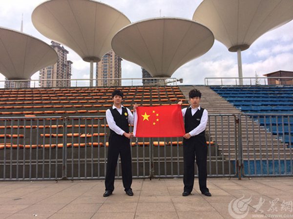 臨沂一中學生在臨沂人民廣場'山高水長'前與國旗合影為中國點贊