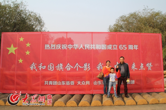 9月29日上午,臨沂市民在書法廣場與國旗合影。