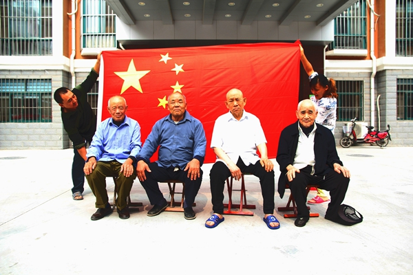 9月24日,博興城張村老年公寓門口,四名退伍老兵與國旗合影,他們當中年齡最大的88歲,最小的80歲。
