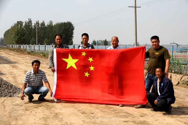 9月27日,博興曹王小學門口施工的6名機器操作手與國旗合影。