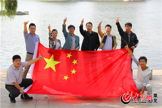 大眾網(wǎng)萊蕪記者站工作人員和國旗合影,為中國點(diǎn)贊。