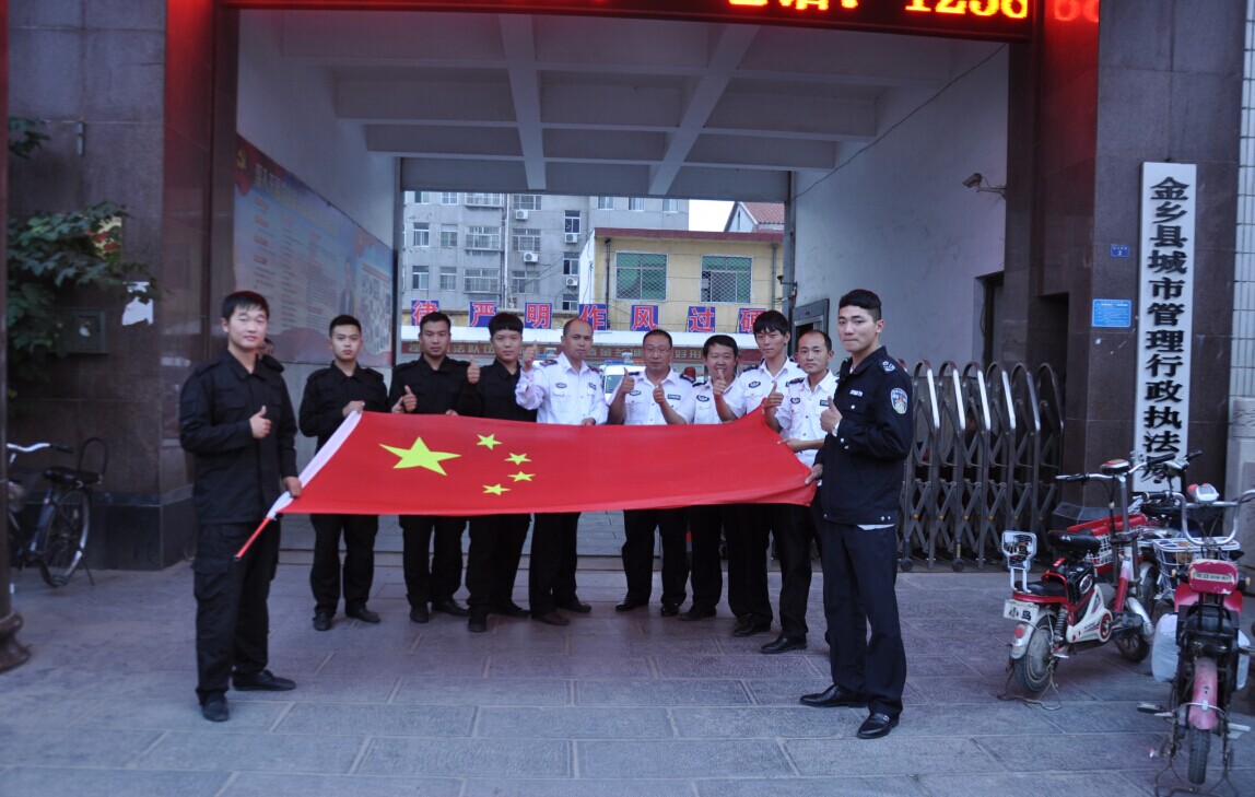 濟寧金鄉(xiāng)執(zhí)法局執(zhí)法人員與國旗合影,為中國點贊。