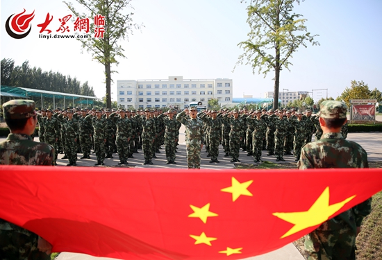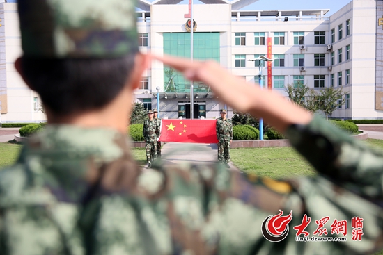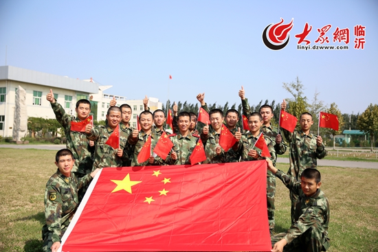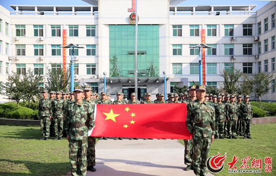 10月1日,武警臨沂支隊剛?cè)胛樾卤c國旗合影,為中國點贊