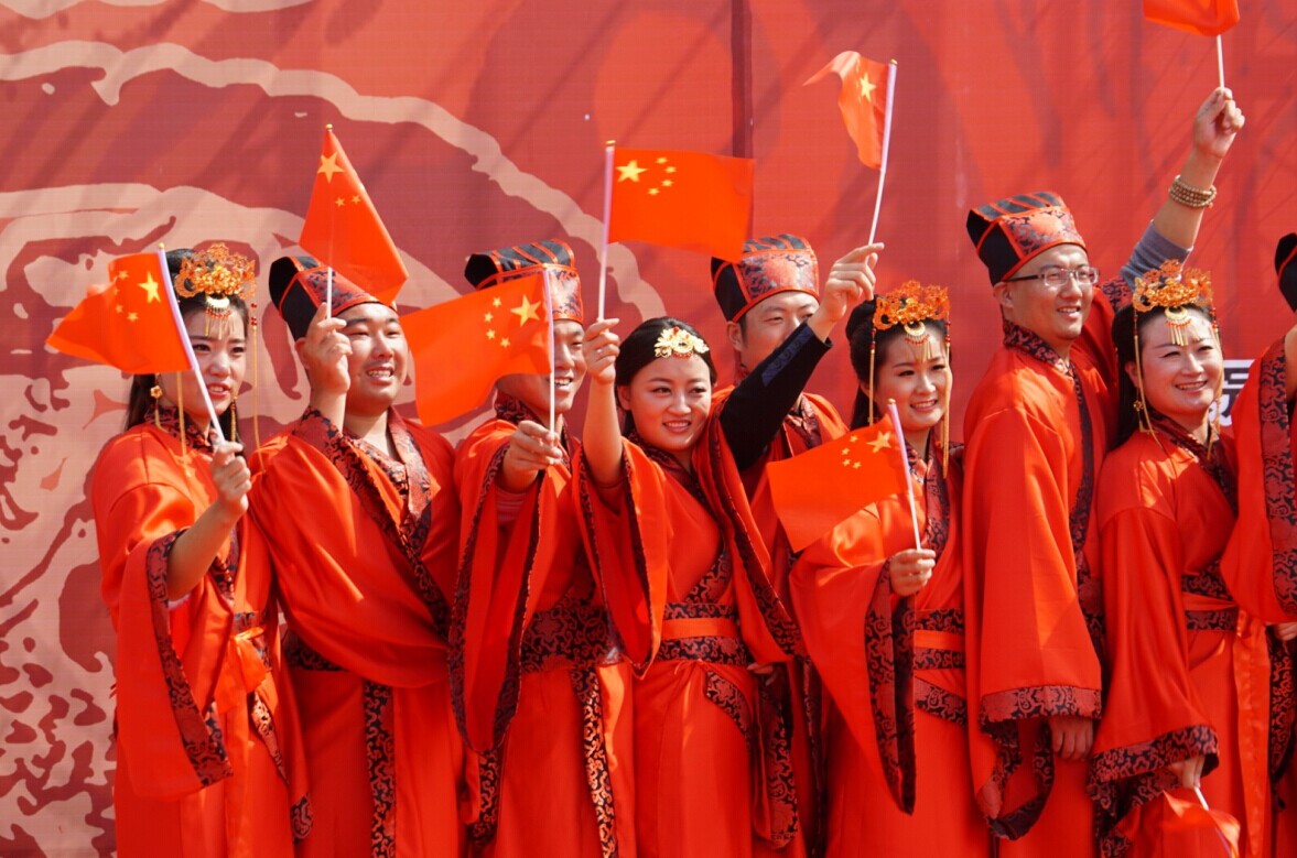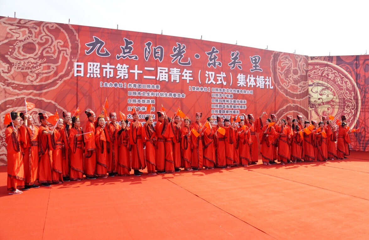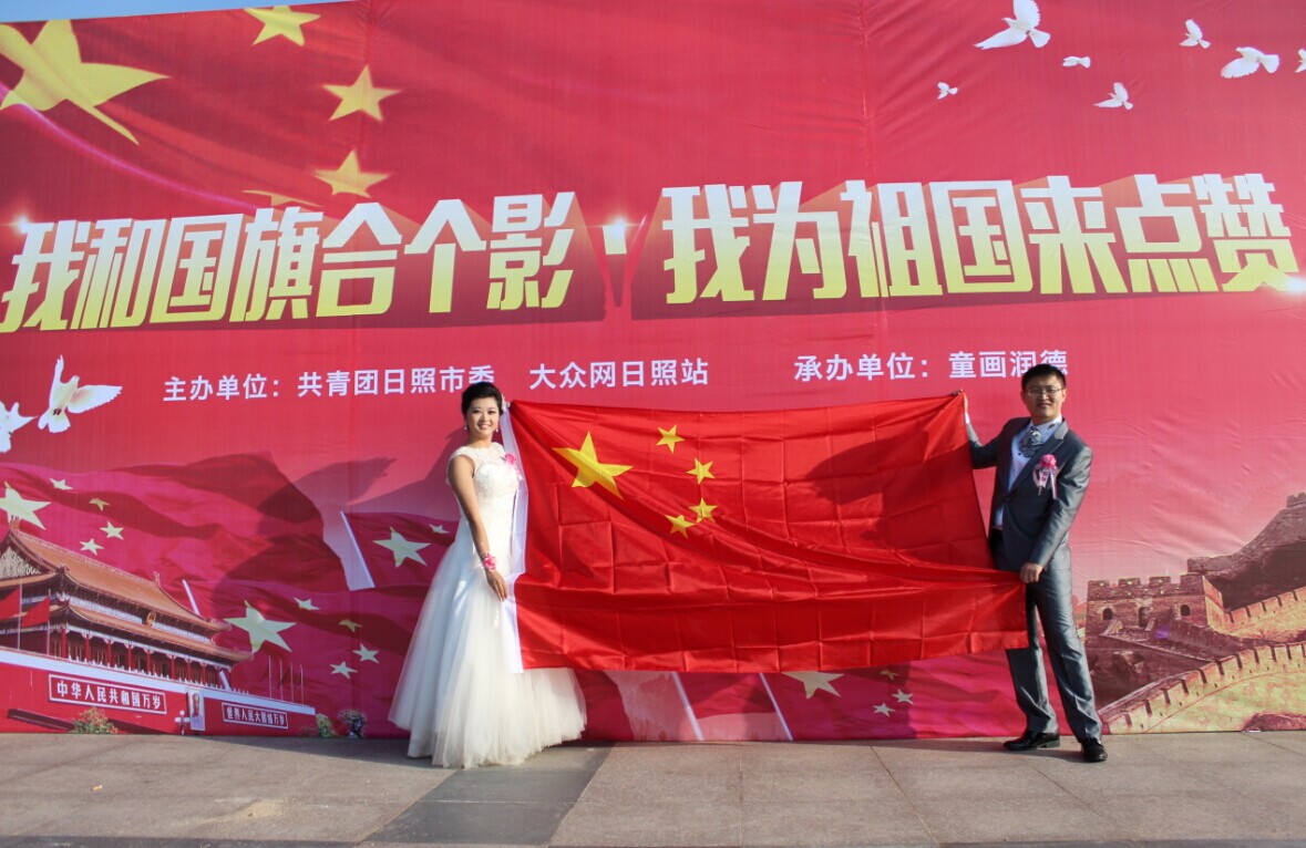 “九點(diǎn)陽光?東關(guān)里”日照2014年青年漢式集體婚禮現(xiàn)場,18對新人與國旗合影,為祖國點(diǎn)贊。