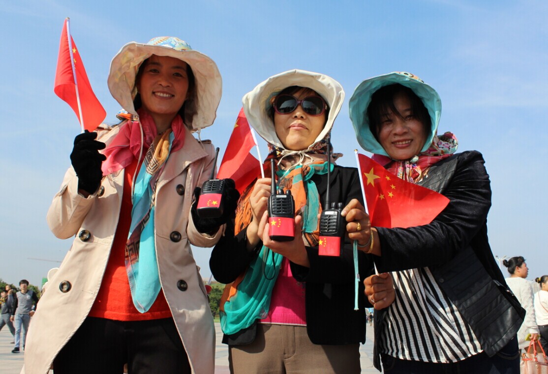 日照市萬平口景區(qū),三位景區(qū)環(huán)衛(wèi)大姐與國旗合影,為祖國點(diǎn)贊。
