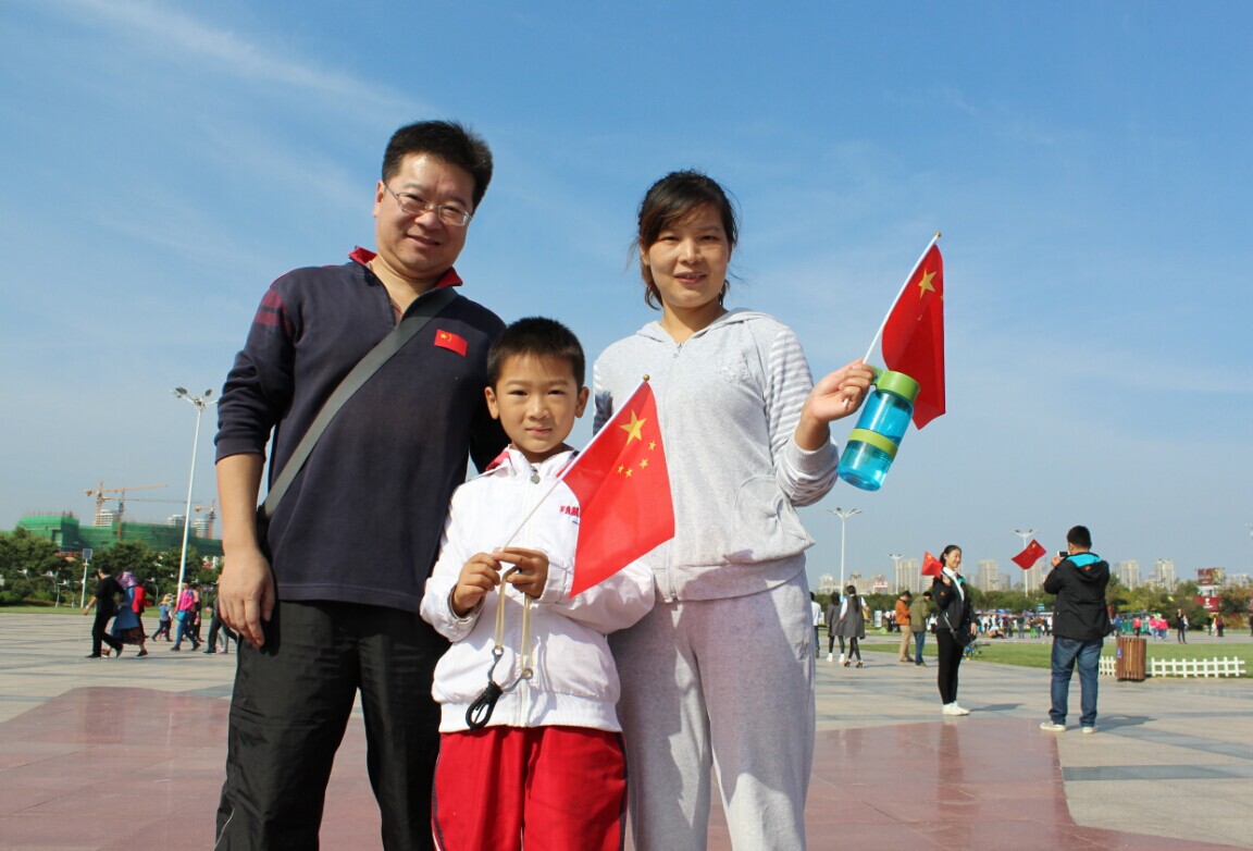 日照市萬平口景區(qū),一家三口與國旗合影,為祖國點(diǎn)贊。