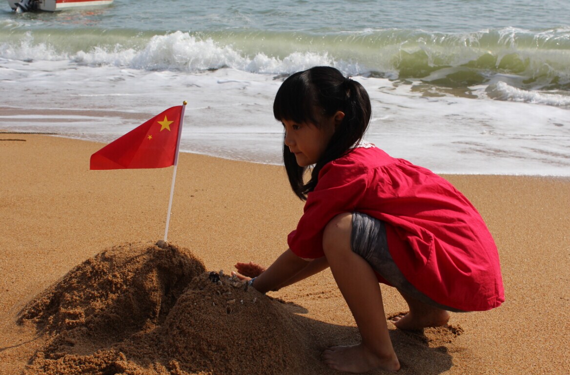 山東省日照市,一位小姑娘在第一海水浴場沙灘上與國旗合影,為祖國點(diǎn)贊。