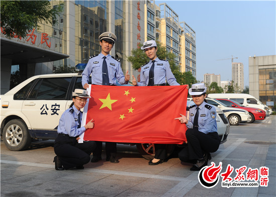 臨沂直屬一大隊(duì)執(zhí)勤民警在金雀山路與沂州路交會(huì)處,與國(guó)旗合影,為中國(guó)點(diǎn)贊