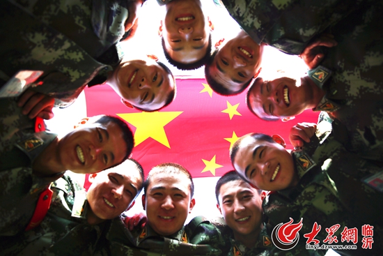 10月1日,武警臨沂支隊剛入伍新兵與國旗合影,為中國點贊