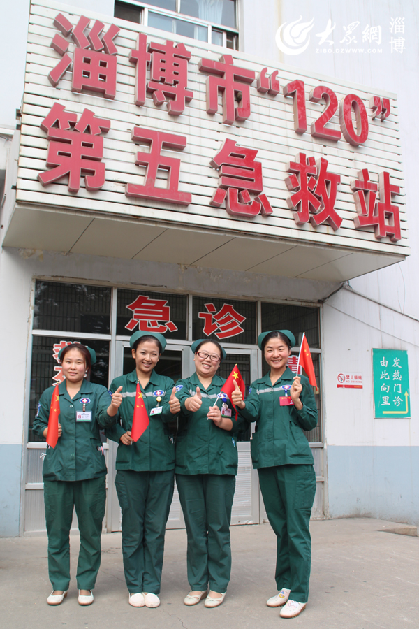 張店區(qū)中醫(yī)院急診科“四朵金花”在淄博市“120”第五急救站門前為“國旗”點(diǎn)贊(趙凱 攝)
