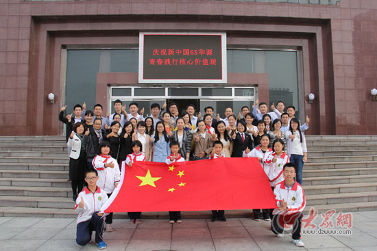 9月29日上午,菏澤冀魯豫革命邊區(qū)紀(jì)念館前,共青團(tuán)菏澤市委組織團(tuán)員與國(guó)旗合影,為祖國(guó)點(diǎn)贊。