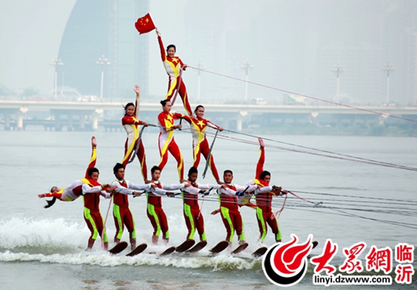中國滑水運動員在臨沂沂河南湖心島水運賽場用藝術滑水表演的形式和國旗合影,為中國點贊。