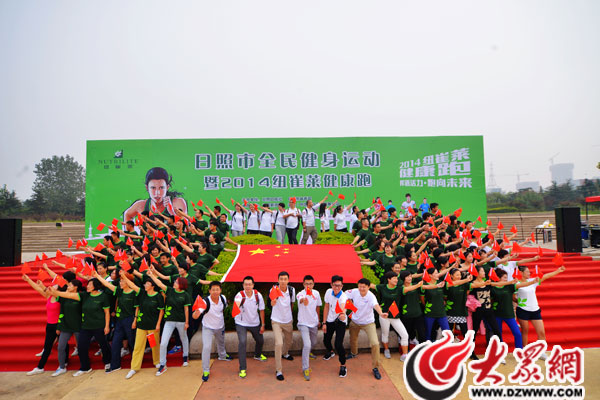 27日,紐崔萊健康跑開始前工作人員在日照市人民政府廣場(chǎng)與國(guó)旗合影,為中國(guó)點(diǎn)贊