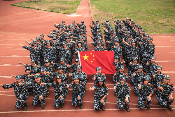 山東師范大學2014級軍訓新生在訓練場地與國旗合影,豎起拇指為中國點贊。