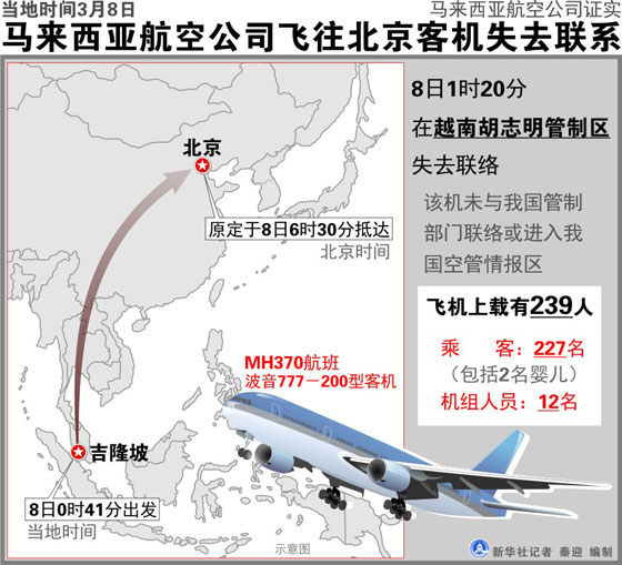 #馬航飛機失聯#【一載239人由吉隆坡飛北京的航班失聯 機上有160名中國人】馬來西亞航空發表聲明說,該公司一架從吉隆坡飛往北京的航班失去聯絡。該飛機航班號為MH370,機型波音777-200,載有239人,包括兩名嬰兒。原定今早6時30分抵達北京;在越南曾與空管聯系后失聯。目前搜索工作已展開。祈禱平安!