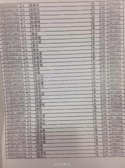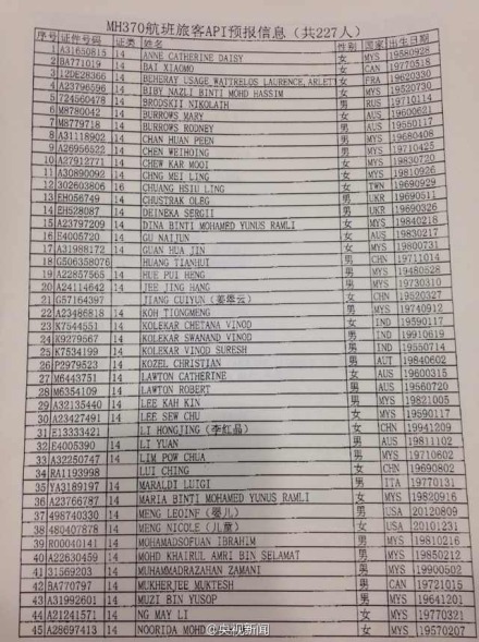 #馬航飛機失聯#【MH370航班乘客名單】馬來西亞航空公司飛往北京的MH370航班,于凌晨2:40失聯。機上共有239人,載有154名中國乘客。據邊檢提供的名單,機上有兩名中國幼童(一男一女)。