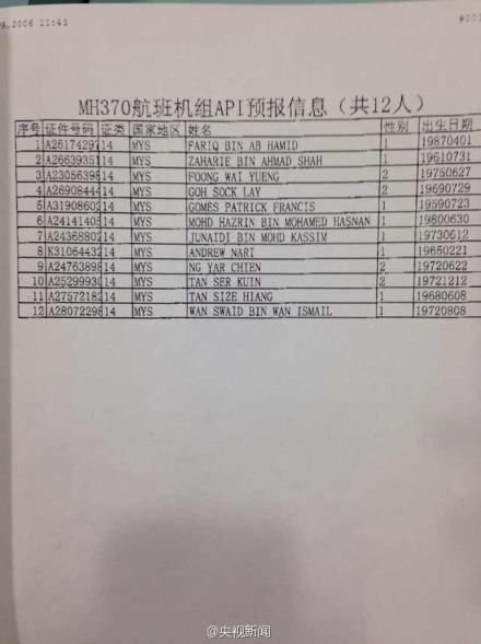 #馬航飛機失聯#【航班飛行員53歲 副機長27歲】①該航班與南航有航班共享代碼。②飛行員現年53歲,自1981年起加入馬航,累計飛行時數達18365小時。③副機長今年27歲,有2763小時飛行經驗。④機長和副機長都是馬來西亞人。