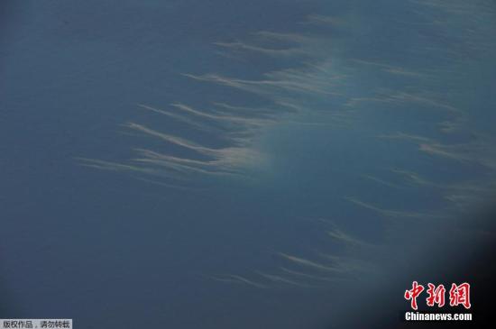3月9日,從越南空軍飛機上拍攝的搜救區(qū)域的油污帶。據(jù)越南媒體報道,越南交通運輸部副部長范貴焦3月9日表示,疑似油污的黃色水痕已經(jīng)開始沿著風(fēng)向擴散,與昨天相比向西南方向傾斜飄移80公里。