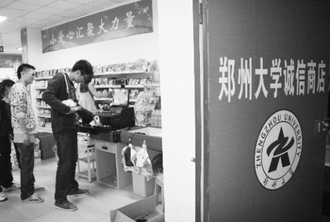 這家名為“鄭州大學誠信商店”的超市,是由鄭州大學學生處建立并且經營的。從掃描條形碼到支付、找零,整個付款流程全由前來購物的學生自行操作收款機完成。 “‘誠信商店’就是要讓同學們自覺做到誠信。試營業近2個月了,還沒有出現過‘不誠信’的行為!必撠熣碡浳锏膹埌⒁陶f到。