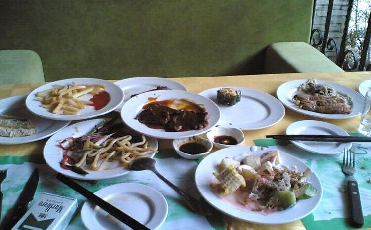 這是網友上傳的一張圖片,桌面上的盤子里不少的飯菜被浪費掉。