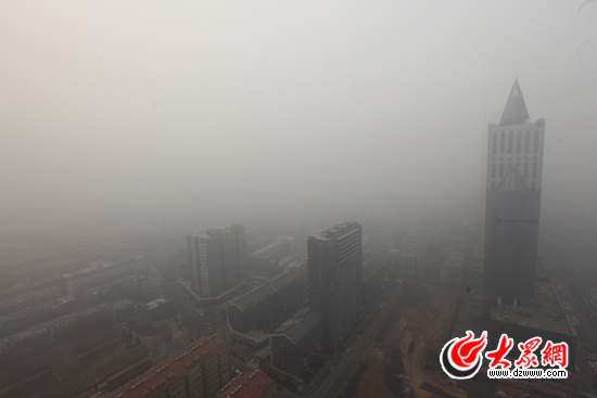 1月7日中午,從30層樓往下看,歷下區的一片居民小區消失在霧霾中。