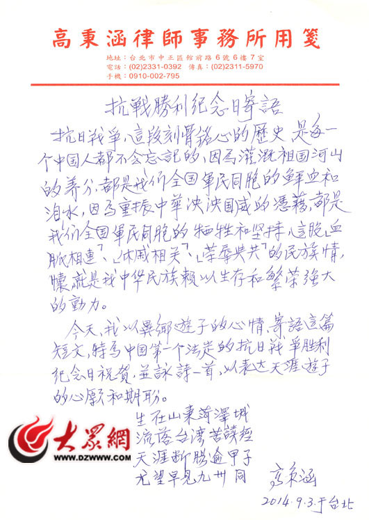 8月28日,當(dāng)我們返回山東后,再次電話聯(lián)系高秉涵先生時(shí),他還在叮囑我們,要把這首詩(shī)寫(xiě)上,在抵抗列強(qiáng)的戰(zhàn)爭(zhēng)年代,中華兒女就是靠了這種打不垮的民族氣節(jié),才戰(zhàn)勝了日本人,每一個(gè)中國(guó)人都應(yīng)該為這分氣節(jié)而自豪。