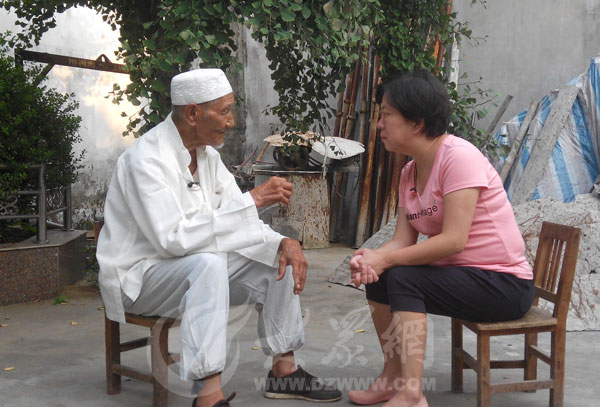 頭戴穆斯林白帽,身著白衣的回民支隊抗戰老兵蘭兆法向大眾網記者講述抗戰往事。大眾網記者攝