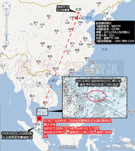 #馬航飛機失聯#【一載239人由吉隆坡飛北京的航班失聯 機上有160名中國人】馬來西亞航空發表聲明說,該公司一架從吉隆坡飛往北京的航班失去聯絡。該飛機航班號為MH370,機型波音777-200,載有239人,包括兩名嬰兒。原定今早6時30分抵達北京;在越南曾與空管聯系后失聯。目前搜索工作已展開。祈禱平安!