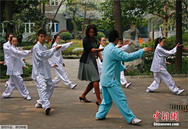米歇爾與成都七中學(xué)生打太極