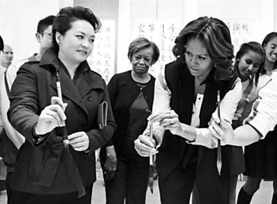 彭麗媛向米歇爾示范如何握筆