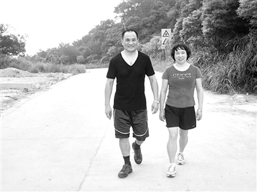 晉江明偉鞋服有限公司董事長張聰明(左)每天堅持爬山,快60歲了還去香港讀MBA。(資料片)
