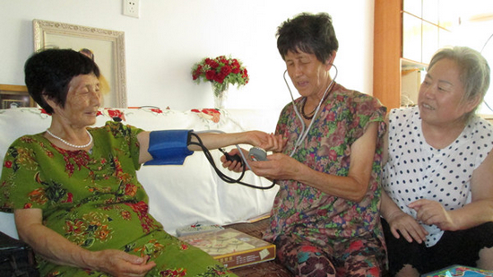 曲秀鳳(中)在給鄰居量血壓。