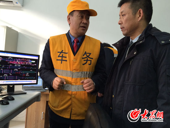 即墨北站行車室里,牟叢峰正在向工作人員了解站點情況.。