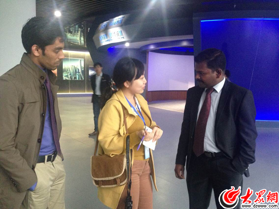 這邊記者們正圍著工作人員問個不停,那邊,戴甜與一名印度專家用英語交流起來。戴甜很好奇印度公司來臨沂開展項目的情況,以及專家自身對在臨沂工作的感受。