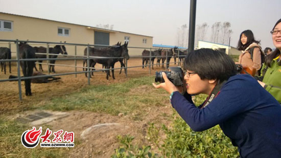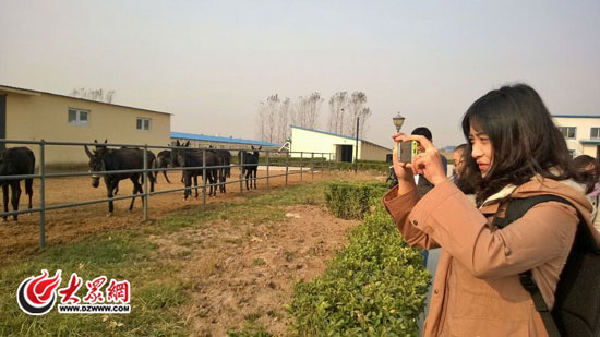 28日上午,聚焦“一圈一帶”第十屆中國網絡媒體山東行采訪團記者們來到位于東阿縣的國家級黑毛驢繁育中心,采訪團的“旅友”與“驢友”們進行親密接觸。記者手機拍張照。