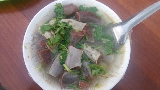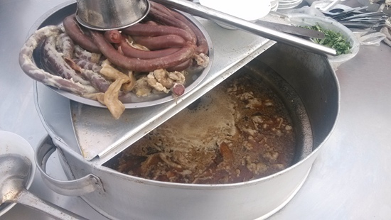 羊腸子也叫清血腸,實際上是由鮮羊腸皮灌入羊血、淀粉、香料,然后在加了多種佐料的老湯里煮熟,再配上湯料盛到碗里食用。羊腸子有肥有瘦,所謂肥瘦就是指腸衣上脂肪的多寡,其中肥腸是老餮們的最愛,去得晚了,經常會點不到,但如果是第一次品嘗羊腸子,還是推薦先吃瘦腸適應一下。