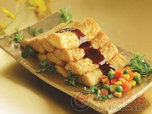 臨清傳統(tǒng)名吃。因賣主總是切好放在一塊特制的長方形木板上出售,故稱“托板豆腐”。在臨清,每天從早到晚都能看到手推車、自行車或是肩挑的小擔(dān)上,放著一大塊用白布包著的顫悠悠、水汪汪、熱乎乎的水豆腐,男女老少爭相購買。尤其是早晨,街頭巷尾隨處可見手捧托板豆腐,吃得滿口香甜、津津有味的顧客。水豆腐是用上等黃豆,經(jīng)脫皮、水泡后、磨成汁,用布濾出豆?jié){,倒入鍋中燒開,加鹵水精心點(diǎn)制而成。其特點(diǎn)是白嫩、細(xì)膩、香甜,營養(yǎng)豐富,便于人體消化吸收,是方便可口的快餐。