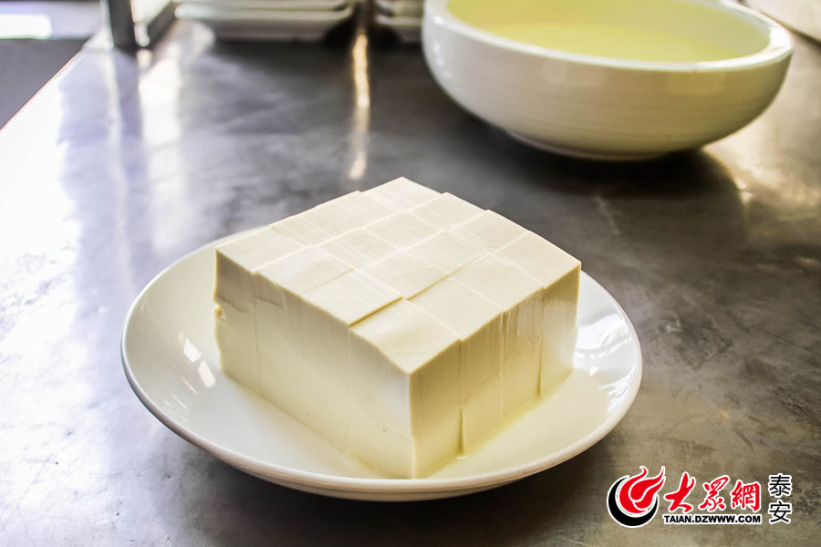 《泰安縣志》記載:“凌晨街街梆子響,晚向戶戶豆腐香,泰城家家豆腐坊。”“三美”之一的豆腐需要使用北方黃豆加石膏制成的石膏豆腐。泰山水高氧、低硬度,用其磨制的豆?jié){蛋白質(zhì)極易凝固,使泰山豆腐具有漿細(xì)水多、質(zhì)嫩不流、潔白如雪、味道甘美、富有彈性、久煮不老不糊等特點。