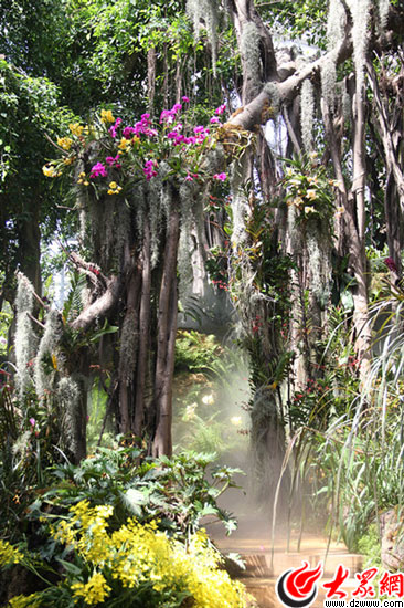 暖溫帶館, 主要體現(xiàn)豐富多彩的熱帶叢林風(fēng)貌。劃分為疏林區(qū)、臺(tái)地花園區(qū)、峽谷瀑布區(qū)、遠(yuǎn)古生物區(qū)、經(jīng)濟(jì)作物區(qū)、奇異榕林區(qū)、棕櫚區(qū)等八大觀景區(qū)。在這里,“獨(dú)木成林”的高山榕自成一景,千年荔枝、“見(jiàn)血封喉”(箭毒木)、猴面包樹(shù)、菩提榕以及酒瓶椰子等紛紛亮相。