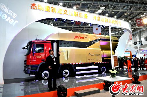 大眾網記者在采訪中了解到,目前國外渦輪壓裂車發動機的最高功率僅為3750hp,作業能力僅與2000型常規壓裂車相當。在國內市場,大功率渦輪壓裂車之所以遲遲沒有出現,超級大泵資源的稀缺是一項重要原因。無獨有偶,世界上功率最大的壓裂大泵(最大輸出功率達5000hp)便是由杰瑞自主研發制造完成的。