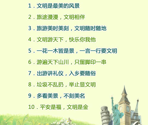 此次評選出的文明旅游十大提醒語,既有提醒游客樹立文明旅游意識的普遍性提示,也有針對出游中常見的不文明陋習,作善意的具體的提醒,內(nèi)容涉及維護環(huán)境衛(wèi)生、遵守公共秩序、保護生態(tài)環(huán)境和文物古跡、尊重別人權利以及出游安全等多個方面。國家旅游局將面向社會和行業(yè),持續(xù)深入宣傳文明旅游提醒語,力求形成廣泛社會共識。