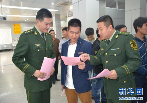 官兵向出入境旅客解說文明出境游倡議書